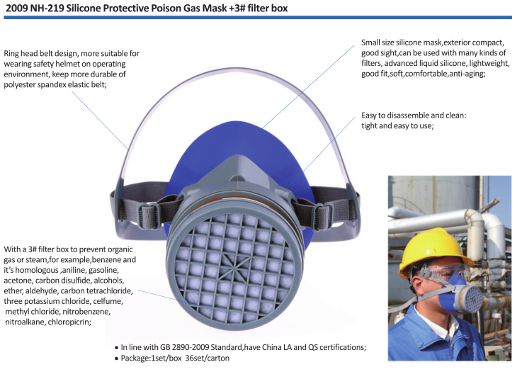 ●With a 3# filter box to prevent organic gas or steam,for example,benzene and it’s homologous ,aniline, gasoline, acetone, carbon disulfide, alcohols, ether, aldehyde, carbon tetrachloride, three potassium chloride, celfume, methyl chloride, nitrobenzene, nitroalkane, chloropicrin;