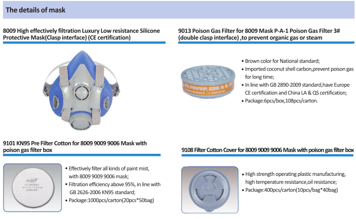 ●With two boxes of P-A-1(3#), to prevent organic gas or steam,for example,benzene and it’s homologous ,aniline, gasoline, acetone, carbon disulfide, alcohols, ether, aldehyde, carbon tetrachloride, three potassium chloride, celfume, methyl chloride, nitrobenzene, nitroalkane, chloropicrin;