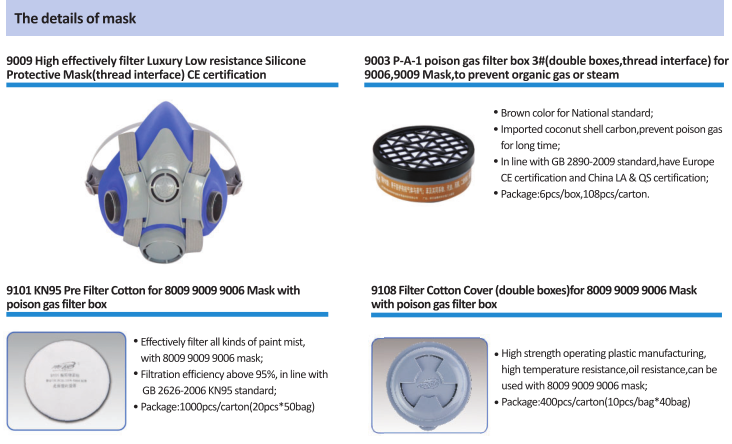 ●With two filters P-A-1(3#), to prevent organic gas or steam,for example,benzene and it’s homologous ,aniline, gasoline, acetone, carbon disulfide, alcohols, ether, aldehyde, carbon tetrachloride, three potassium chloride, celfume, methyl chloride, nitrobenzene, nitroalkane, chloropicrin;