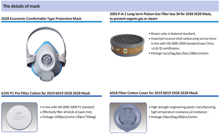 ●With a filter box P-A-1(3#), to prevent organic gas or steam,for example,benzene and it’s homologous ,aniline, gasoline, acetone, carbon disulfide, alcohols, ether, aldehyde, carbon tetrachloride, three potassium chloride, celfume, methyl chloride, nitrobenzene, nitroalkane, chloropicrin;