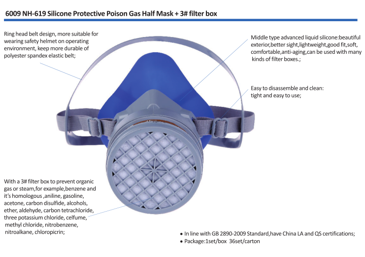●With a 3# filter box to prevent organic gas or steam,for example,benzene and it’s homologous ,aniline, gasoline, acetone, carbon disulfide, alcohols, ether, aldehyde, carbon tetrachloride, three potassium chloride, celfume, methyl chloride, nitrobenzene, nitroalkane, chloropicrin;