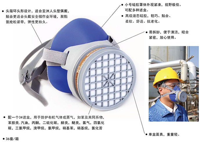 2.配一個(gè)3#濾盒,用于防護有機氣體或蒸氣,如苯及其同系物,苯胺類(lèi),汽油,丙酮,二硫化碳,醇類(lèi),醚類(lèi),氯氣,四氯化碳,三氯甲烷,溴甲烷,硝基苯,硝基烷,氯化苦
